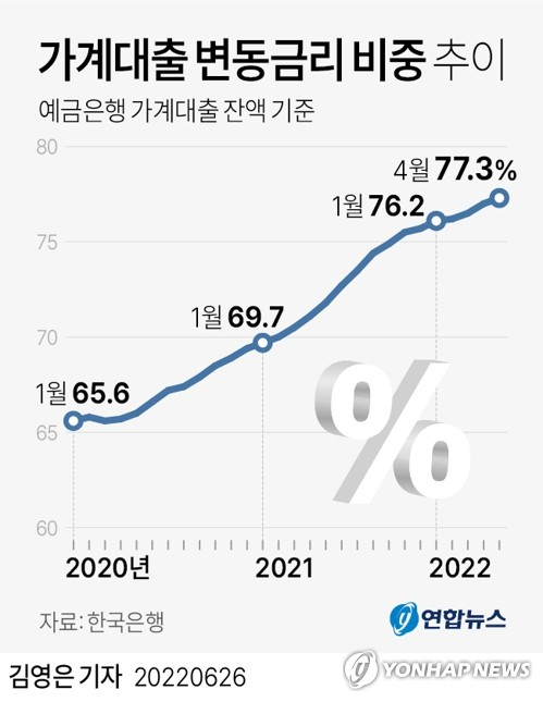 이창용, 빅스텝 가능성에 "물가뿐 아니라 변동금리 많아 이자부담 고려"26일 한국은행의 경제통계시스템(ECOS)에 따르면 4월 기준 예금은행의 가계대출 잔액 가운데 변동금리 비중은 77.3%로, 2014년 3월(78.6%) 이후 8년 1개월 만에 가장 높아졌다.