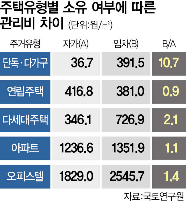 그 결과 단독·다가구주택의 경우 세입자가 부담하는 관리비가 집주인의 10배 이상 차이가 나는 것으로 분석됐다.